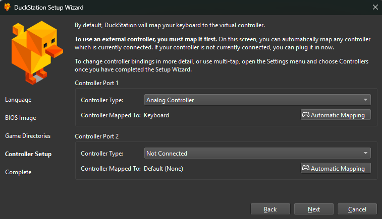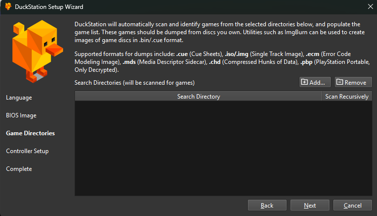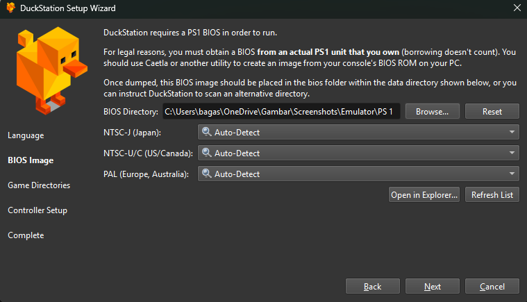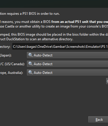 Setelah itu langsung saja buka folder yang sudah di ekstrak dan jalankan emulator DuckStation nya, kemudian BIOS Directory pilih Browse dan pilih folder tempat menyimpan BIOS yang sudah di download. kemudian pilih next