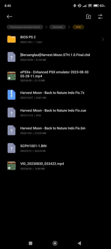 Setelah itu pilih folder bios dan download filenya, kemudian pilih folder ROM terus PS 1 dan download file Harvest Moon BTN fix.